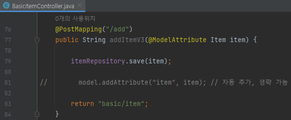 @PostMapping("/add") public String addItemV3(@ModelAttribute Item item) { itemRepository.save(item); // model.addAttribute("item", item); // 자동 추가, 생략 가능 return "basic/item"; }