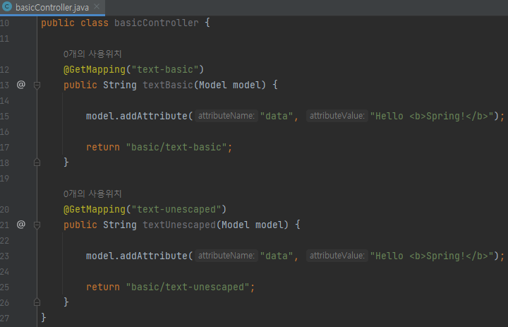 package hello.thymeleaf.basic; import org.springframework.stereotype.Controller; import org.springframework.ui.Model; import org.springframework.web.bind.annotation.GetMapping; import org.springframework.web.bind.annotation.RequestMapping; @Controller @RequestMapping("/basic") public class basicController { @GetMapping("text-basic") public String textBasic(Model model) { model.addAttribute("data", "Hello <b>Spring!</b>"); return "basic/text-basic"; } @GetMapping("text-unescaped") public String textUnescaped(Model model) { model.addAttribute("data", "Hello <b>Spring!</b>"); return "basic/text-unescaped"; } }