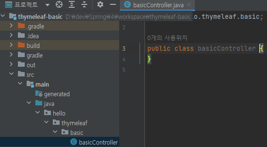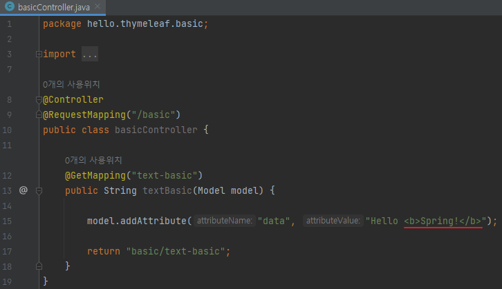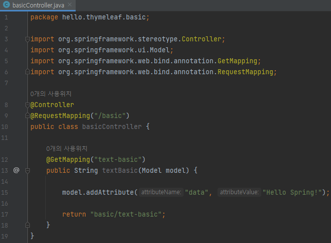 package hello.thymeleaf.basic; import org.springframework.stereotype.Controller; import org.springframework.ui.Model; import org.springframework.web.bind.annotation.GetMapping; import org.springframework.web.bind.annotation.RequestMapping; @Controller @RequestMapping("/basic") public class basicController { @GetMapping("text-basic") public String textBasic(Model model) { model.addAttribute("data", "Hello Spring!"); return "basic/text-basic"; } }