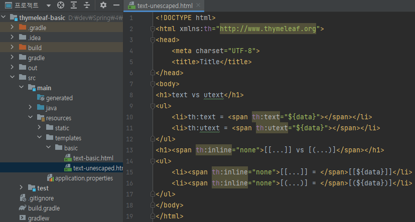 th:inline="none" : 타임리프는 [[...]]를 해석하기 때문에, 화면에 [[...]] 글자를 보여줄 수 없다. 이 테그 안에서는 타임리프가 해석하지 말라는 옵션이다.