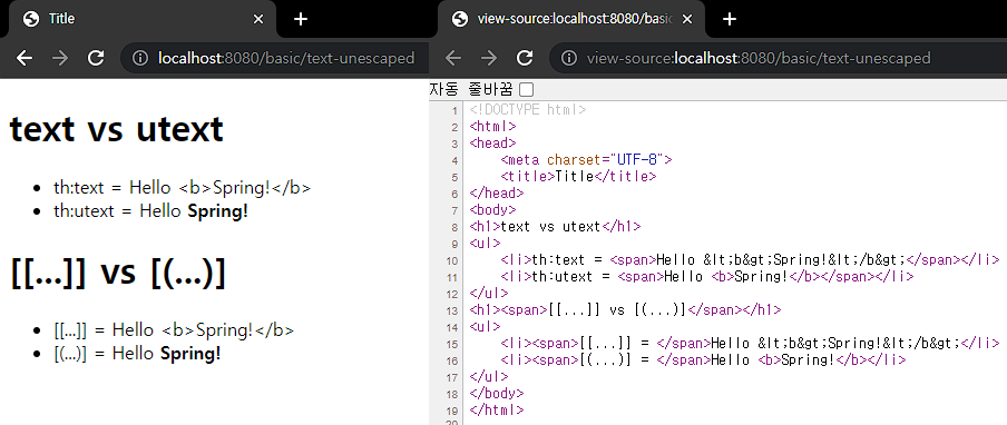 웹 브라우저는 <를 HTML 테그의 시작으로 인식한다. 따라서 <를 테그의 시작이 아니라 문자로 표현할 수 있는 방법이 필요한데, 이것을 HTML 엔티티라 한다. 그리고 이렇게 HTML에서 사용하는 특수 문자를 HTML 엔티티로 변경하는 것을 이스케이프(escape)라 한다. 그리고 타임리프가 제공하는 th:text, [[...]]는 기본적으로 이스케이스(escape)를 제공한다.