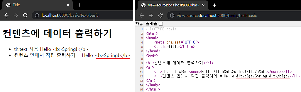 HTML 문서는 <, > 같은 특수 문자를 기반으로 정의된다. 따라서 뷰 템플릿으로 HTML 화면을 생성할 때는 출력하는 데이터에 이러한 특수 문자가 있는 것을 주의해서 사용해야 한다.