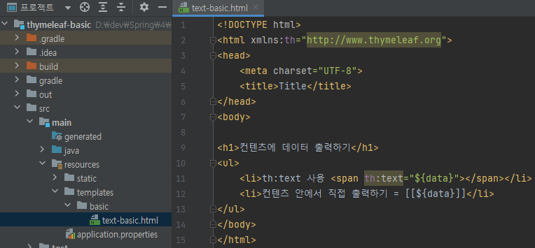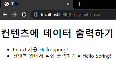타임리프는 기본적으로 HTML 테그의 속성에 기능을 정의해서 동작한다. HTML의 콘텐츠(content)에 데이터를 출력할 때는 다음과 같이 th:text를 사용하면 된다.