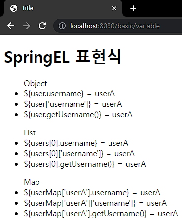 <!DOCTYPE html> <html xmlns:th="http://www.thymeleaf.org"> <head> <meta charset="UTF-8"> <title>Title</title> </head> <body> <h1>SpringEL 표현식</h1> <ul>Object <li>${user.username} = <span th:text="${user.username}"></span></li> <li>${user['username']} = <span th:text="${user['username']}"></span></li> <li>${user.getUsername()} = <span th:text="${user.getUsername()}"></span></li> </ul> <ul>List <li>${users[0].username} = <span th:text="${users[0].username}"></span></li> <li>${users[0]['username']} = <span th:text="${users[0]['username']}"></span></li> <li>${users[0].getUsername()} = <span th:text="${users[0].getUsername()}"></span></li> </ul> <ul>Map <li>${userMap['userA'].username} = <span th:text="${userMap['userA'].username}"></span></li> <li>${userMap['userA']['username']} = <span th:text="${userMap['userA']['username']}"></span></li> <li>${userMap['userA'].getUsername()} = <span th:text="${userMap['userA'].getUsername()}"></span></li> </ul> </body> </html>
