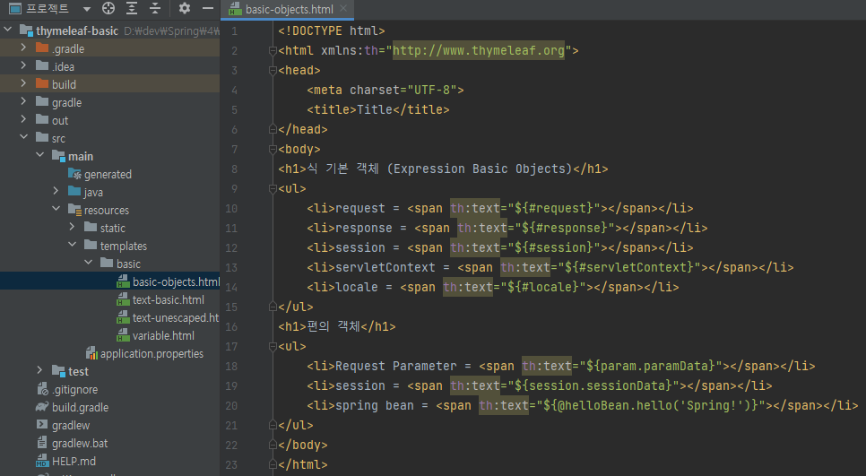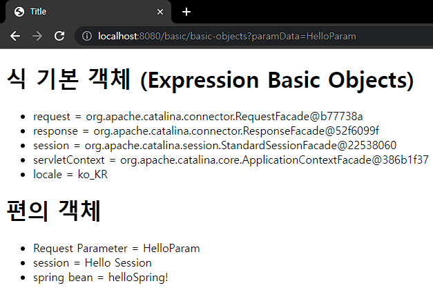 <!DOCTYPE html> <html xmlns:th="http://www.thymeleaf.org"> <head> <meta charset="UTF-8"> <title>Title</title> </head> <body> <h1>식 기본 객체 (Expression Basic Objects)</h1> <ul> <li>request = <span th:text="${#request}"></span></li> <li>response = <span th:text="${#response}"></span></li> <li>session = <span th:text="${#session}"></span></li> <li>servletContext = <span th:text="${#servletContext}"></span></li> <li>locale = <span th:text="${#locale}"></span></li> </ul> <h1>편의 객체</h1> <ul> <li>Request Parameter = <span th:text="${param.paramData}"></span></li> <li>session = <span th:text="${session.sessionData}"></span></li> <li>spring bean = <span th:text="${@helloBean.hello('Spring!')}"></span></li> </ul> </body> </html>
