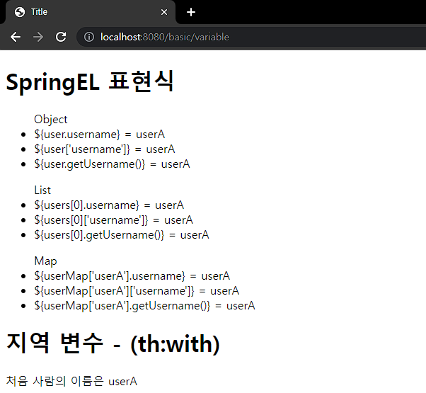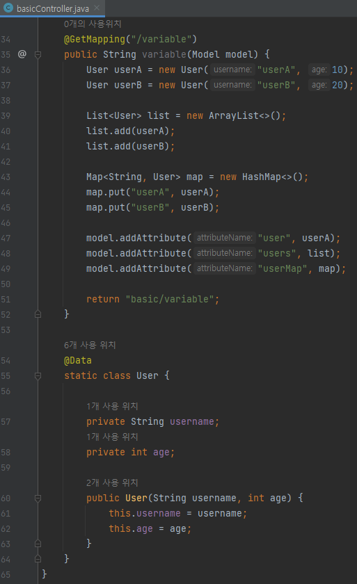 @GetMapping("/variable") public String variable(Model model) { User userA = new User("userA", 10); User userB = new User("userB", 20); List<User> list = new ArrayList<>(); list.add(userA); list.add(userB); Map<String, User> map = new HashMap<>(); map.put("userA", userA); map.put("userB", userB); model.addAttribute("user", userA); model.addAttribute("users", list); model.addAttribute("userMap", map); return "basic/variable"; } @Data static class User { private String username; private int age; public User(String username, int age) { this.username = username; this.age = age; } }