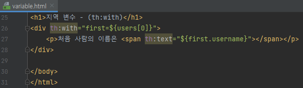 <h1>지역 변수 - (th:with)</h1> <div th:with="first=${users[0]}"> <p>처음 사람의 이름은 <span th:text="${first.username}"></span></p> </div>