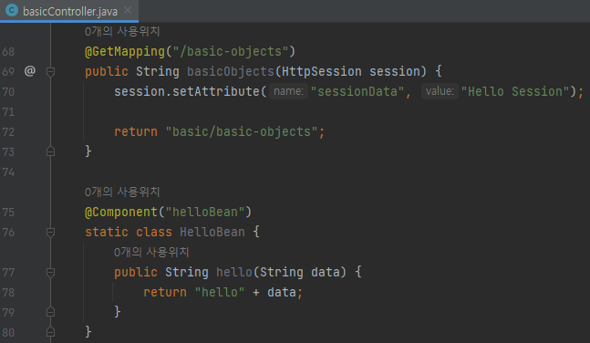 @GetMapping("/basic-objects") public String basicObjects(HttpSession session) { session.setAttribute("sessionData", "Hello Session"); return "basic/basic-objects"; } @Component("helloBean") static class HelloBean { public String hello(String data) { return "hello" + data; } }
