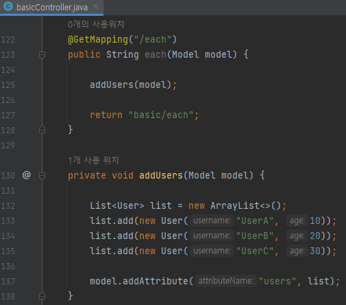 @GetMapping("/each") public String each(Model model) { addUsers(model); return "basic/each"; } private void addUsers(Model model) { List<User> list = new ArrayList<>(); list.add(new User("UserA", 10)); list.add(new User("UserB", 20)); list.add(new User("UserC", 30)); model.addAttribute("users", list); }