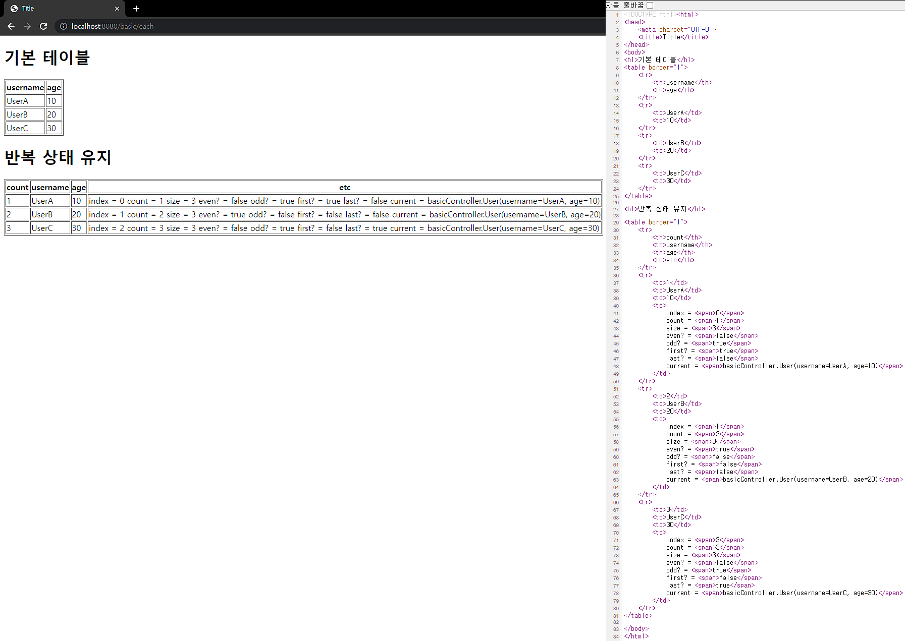 <!DOCTYPE html><html xmlns:th="http://www.thymeleaf.org"> <head> <meta charset="UTF-8"> <title>Title</title> </head> <body> <h1>기본 테이블</h1> <table border="1"> <tr> <th>username</th> <th>age</th> </tr> <tr th:each="user : ${users}"> <td th:text="${user.username}">username</td> <td th:text="${user.age}">0</td> </tr> </table> <h1>반복 상태 유지</h1> <table border="1"> <tr> <th>count</th> <th>username</th> <th>age</th> <th>etc</th> </tr> <tr th:each="user, userStat : ${users}"> <td th:text="${userStat.count}">username</td> <td th:text="${user.username}">username</td> <td th:text="${user.age}">0</td> <td> index = <span th:text="${userStat.index}"></span> count = <span th:text="${userStat.count}"></span> size = <span th:text="${userStat.size}"></span> even? = <span th:text="${userStat.even}"></span> odd? = <span th:text="${userStat.odd}"></span> first? = <span th:text="${userStat.first}"></span> last? = <span th:text="${userStat.last}"></span> current = <span th:text="${userStat.current}"></span> </td> </tr> </table> </body> </html>