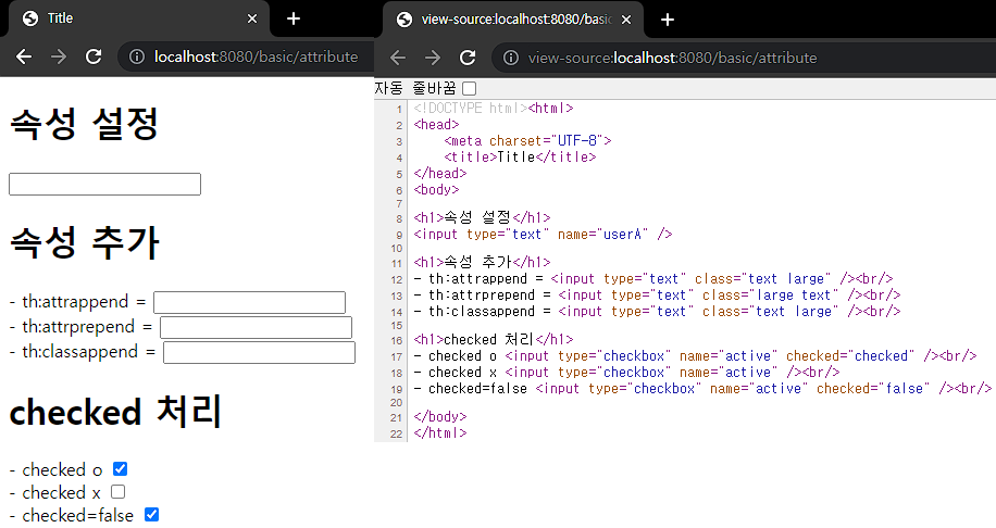 <!DOCTYPE html><html xmlns:th="http://www.thymeleaf.org"> <head> <meta charset="UTF-8"> <title>Title</title> </head> <body> <h1>속성 설정</h1> <input type="text" name="mock" th:name="userA" /> <h1>속성 추가</h1> - th:attrappend = <input type="text" class="text" th:attrappend="class=' large'" /><br/> - th:attrprepend = <input type="text" class="text" th:attrprepend="class='large '" /><br/> - th:classappend = <input type="text" class="text" th:classappend="large" /><br/> <h1>checked 처리</h1> - checked o <input type="checkbox" name="active" th:checked="true" /><br/> - checked x <input type="checkbox" name="active" th:checked="false" /><br/> - checked=false <input type="checkbox" name="active" checked="false" /><br/> </body> </html>