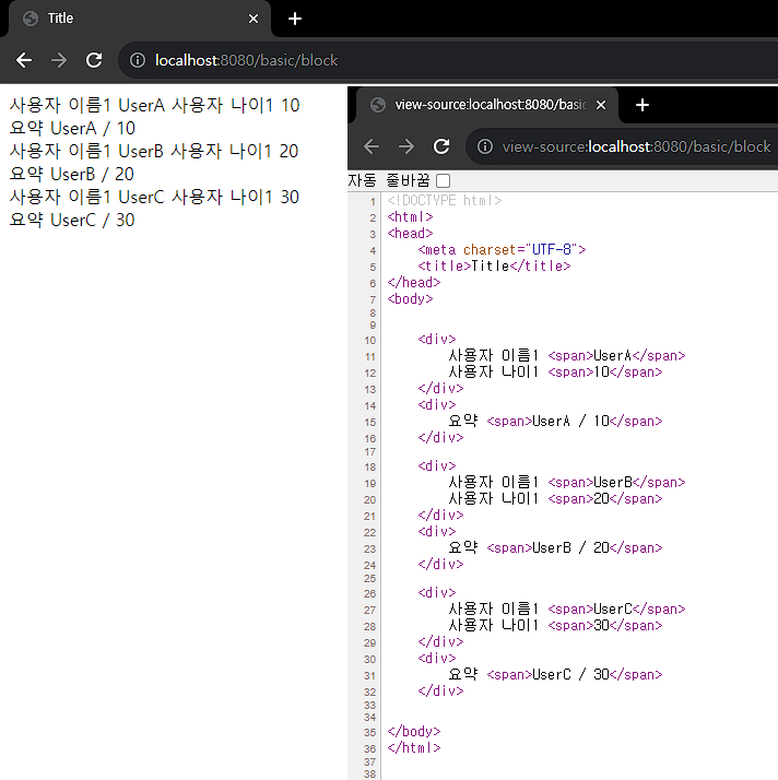 <!DOCTYPE html> <html xmlns:th="http://www.thymeleaf.org"> <head> <meta charset="UTF-8"> <title>Title</title> </head> <body> <th:block th:each="user : ${users}"> <div> 사용자 이름1 <span th:text="${user.username}"></span> 사용자 나이1 <span th:text="${user.age}"></span> </div> <div> 요약 <span th:text="${user.username} + ' / ' + ${user.age}"></span> </div> </th:block> </body> </html>