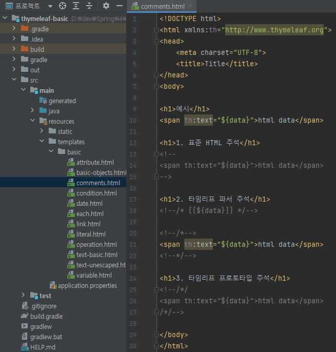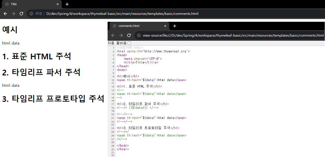 타임리프 프로토타입은 약간 특이한데, HTML 주석에 약간의 구문을 더했다.
