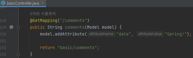 @GetMapping("/comments") public String comments(Model model) { model.addAttribute("data", "Spring!"); return "basic/comments"; }