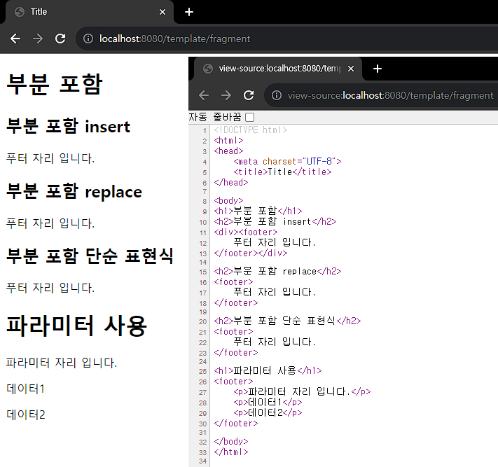 </footer>~{...}를 사용하는 것이 원칙이지만 템플릿 조각을 사용하는 코드가 단순하면 이 부분을 생략할 수 있다.