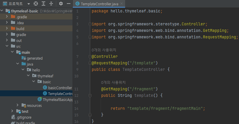 main/java/hello/thymeleaf/basic/TemplateController 생성