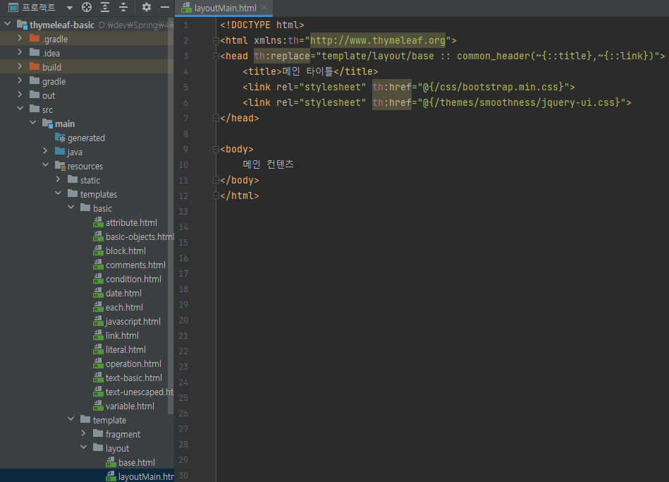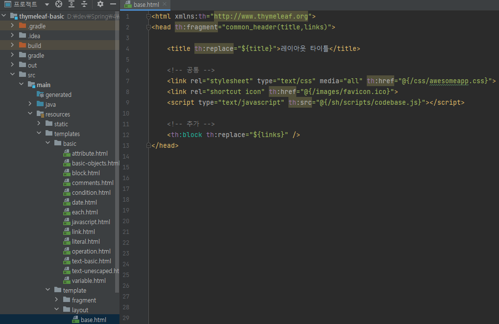 기본 레이아웃을 가지고 있는데, <html>에 th:fragment 속성이 정의되어 있다. 이 레이아웃 파일을 기본으로 하고 여기에 필요한 내용을 전달해서 부분부분 변경하는 것으로 이해하면 된다.