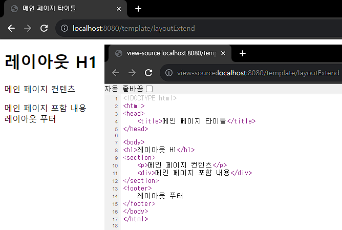 <!DOCTYPE html> <html th:replace="~{template/layoutExtend/layoutFile :: layout(~{::title},~{::section})}" xmlns:th="http://www.thymeleaf.org"> <head> <title>메인 페이지 타이틀</title> </head> <body> <section> <p>메인 페이지 컨텐츠</p> <div>메인 페이지 포함 내용</div> </section> </body> </html>
