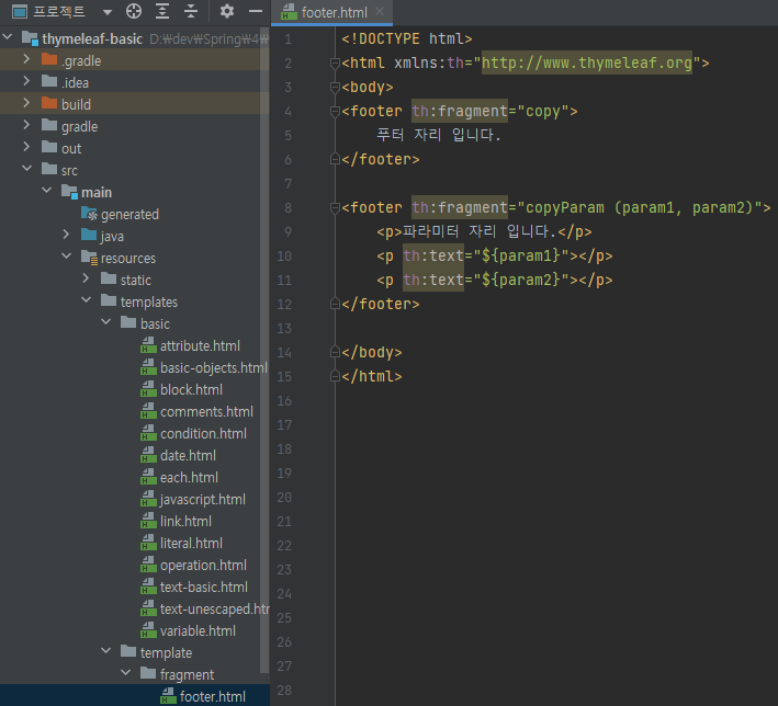 <!DOCTYPE html> <html xmlns:th="http://www.thymeleaf.org"> <body> <footer th:fragment="copy"> 푸터 자리 입니다. </footer> <footer th:fragment="copyParam (param1, param2)"> <p>파라미터 자리 입니다.</p> <p th:text="${param1}"></p> <p th:text="${param2}"></p> </footer> </body> </html>