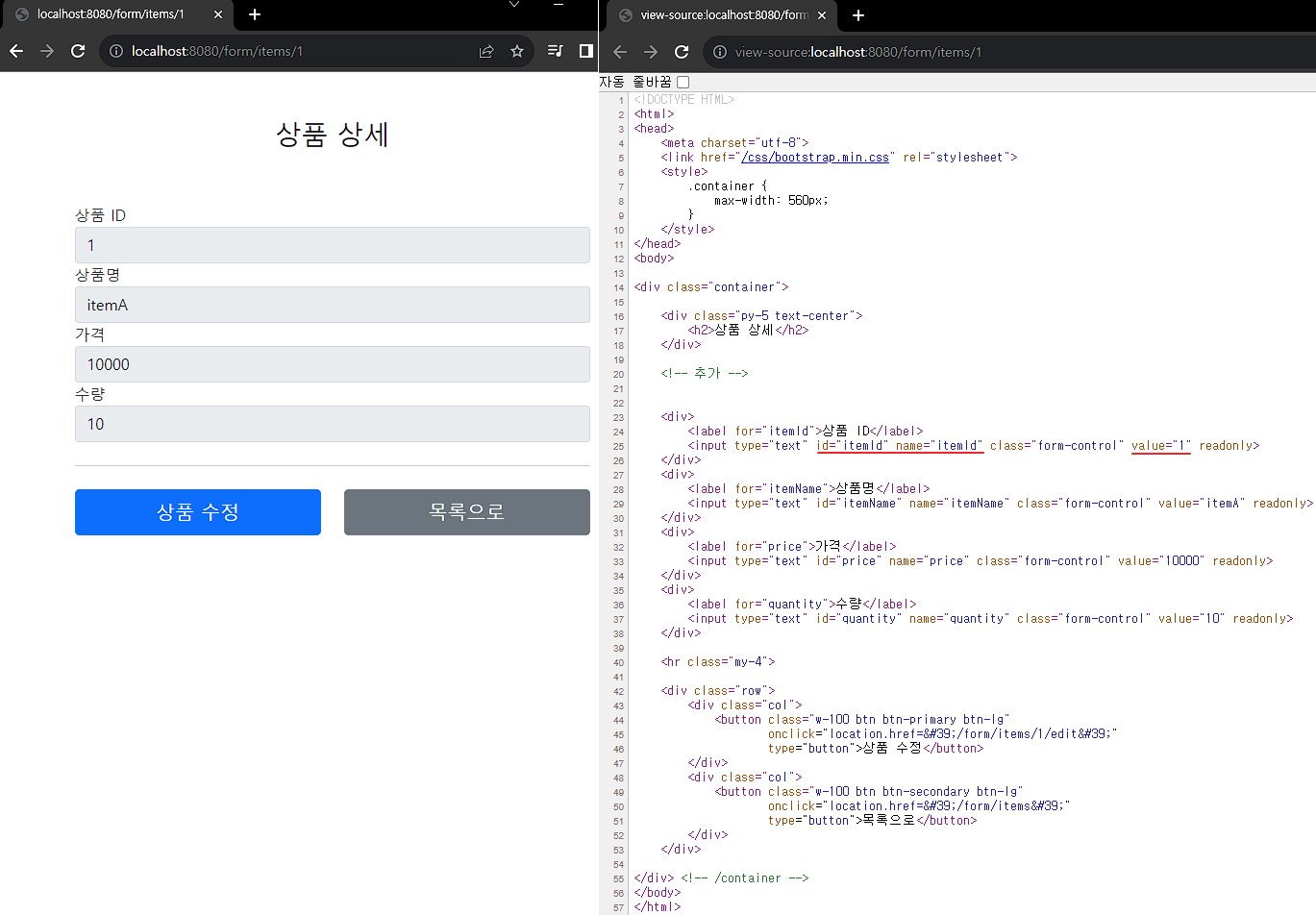 수정 폼은 앞서 설명한 내용과 같다. 수정 폼의 경우 id , name , value를 모두 신경 써야 했는데, 많은 부분이 th:field 덕분에 자동으로 처리되는 것을 확인할 수 있다.