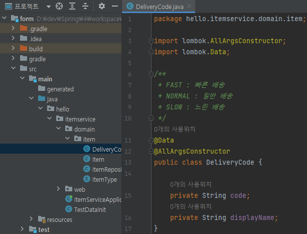 main/java/hello/itemservice/domain/item/DeliveryCode 생성