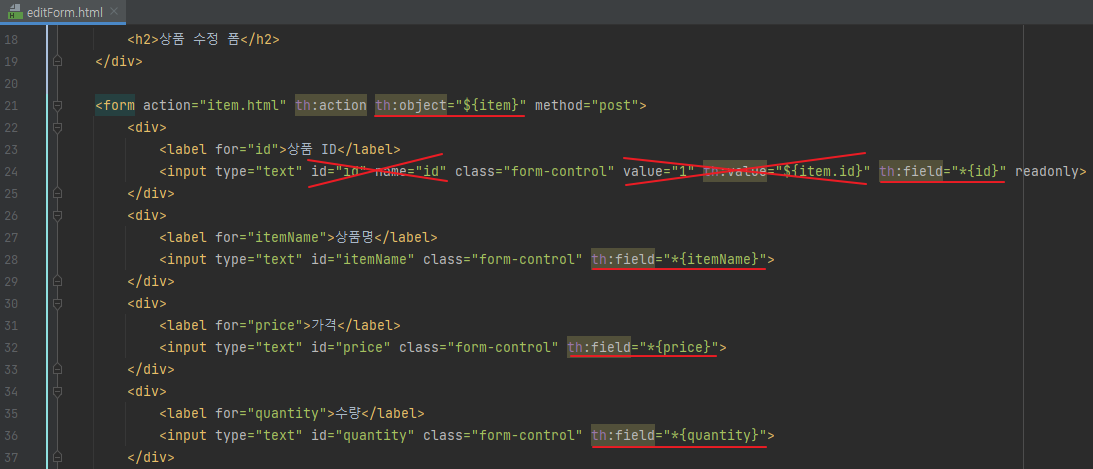<form action="item.html" th:action th:object="${item}" method="post"> <div> <label for="id">상품 ID</label> <input type="text" id="id" name="id" class="form-control" value="1" th:value="${item.id}" th:field="*{id}" readonly> </div> <div> <label for="itemName">상품명</label> <input type="text" id="itemName" class="form-control" th:field="*{itemName}"> </div> <div> <label for="price">가격</label> <input type="text" id="price" class="form-control" th:field="*{price}"> </div> <div> <label for="quantity">수량</label> <input type="text" id="quantity" class="form-control" th:field="*{quantity}"> </div>