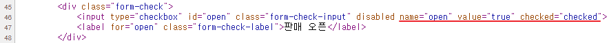 <!-- single checkbox --> <div>판매 여부</div> <div> <div class="form-check"> <input type="checkbox" id="open" name="open" class="form-check-input"> <label for="open" class="form-check-label">판매 오픈</label> </div> </div>