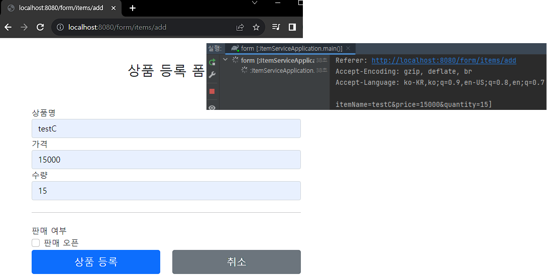 체크 박스를 체크하면 HTML Form에서 open=on이라는 값이 넘어간다. 스프링은 on이라는 문자를 true타입으로 변환해 준다. (스프링 타입 컨버터가 이 기능을 수행하는데, 뒤에서 설명한다.)