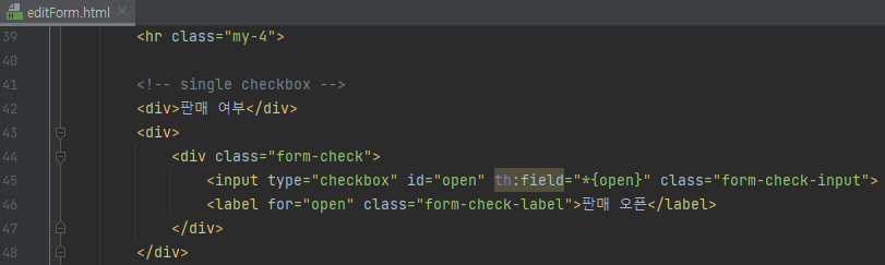 <!-- single checkbox --> <div>판매 여부</div> <div> <div class="form-check"> <input type="checkbox" id="open" th:field="*{open}" class="form-check-input"> <label for="open" class="form-check-label">판매 오픈</label> </div> </div>