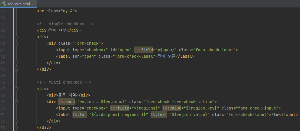 <!-- multi checkbox --> <div> <div>등록 지역</div> <div th:each="region : ${regions}" class="form-check form-check-inline"> <input type="checkbox" th:field="*{regions}" th:value="${region.key}" class="form-check-input"> <label th:for="${#ids.prev('regions')}" th:text="${region.value}" class="form-check-label">서울</label> </div> </div>