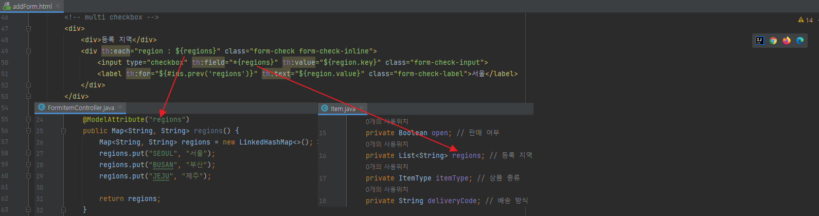 _regions가 체크박스 숫자만큼 생성될 필요는 없지만, 타임리프가 생성되는 옵션 수 만큼 생성해서 그런 것이니 무시하자.item.html - 추가