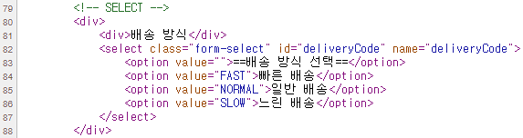 <!-- SELECT --> <div> <div>배송 방식</div> <select th:field="*{deliveryCode}" class="form-select"> <option value="">==배송 방식 선택==</option> <option th:each="deliveryCode : ${deliveryCodes}" th:value="${deliveryCode.code}" th:text="${deliveryCode.displayName}">FAST</option> </select> </div> <hr class="my-4">