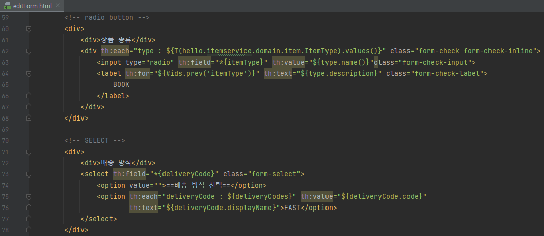 주의 : item.html에는 th:object를 사용하지 않았기 때문에 th:field 부분에 ${item.deliveryCode}으로 적어주어야 한다.