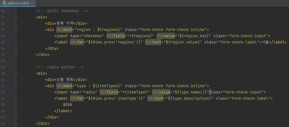 <!-- radio button --> <div> <div>상품 종류</div> <div th:each="type : ${itemTypes}" class="form-check form-check-inline"> <input type="radio" th:field="*{itemType}" th:value="${type.name()}"class="form-check-input"> <label th:for="${#ids.prev('itemType')}" th:text="${type.description}" class="form-check-label"> BOOK </label> </div> </div>