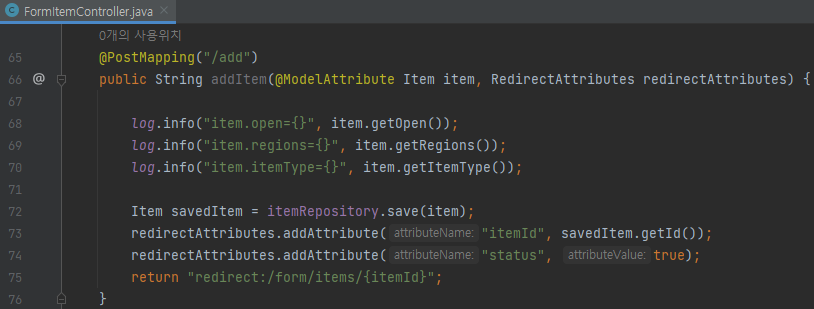 itemTypes를 등록 폼, 조회, 수정 폼에서 모두 사용하므로 @ModelAttribute의 특별한 사용법을 적용하자.