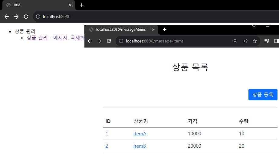 메시지와 국제화 기능을 직접 구현할 수도 있겠지만, 스프링은 기본적인 메시지와 국제화 기능을 모두 제공한다. 그리고 타임리프도 스프링이 제공하는 메시지와 국제화 기능을 편리하게 통합해서 제공한다.
