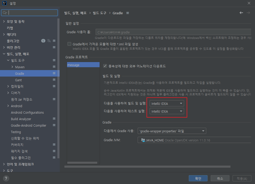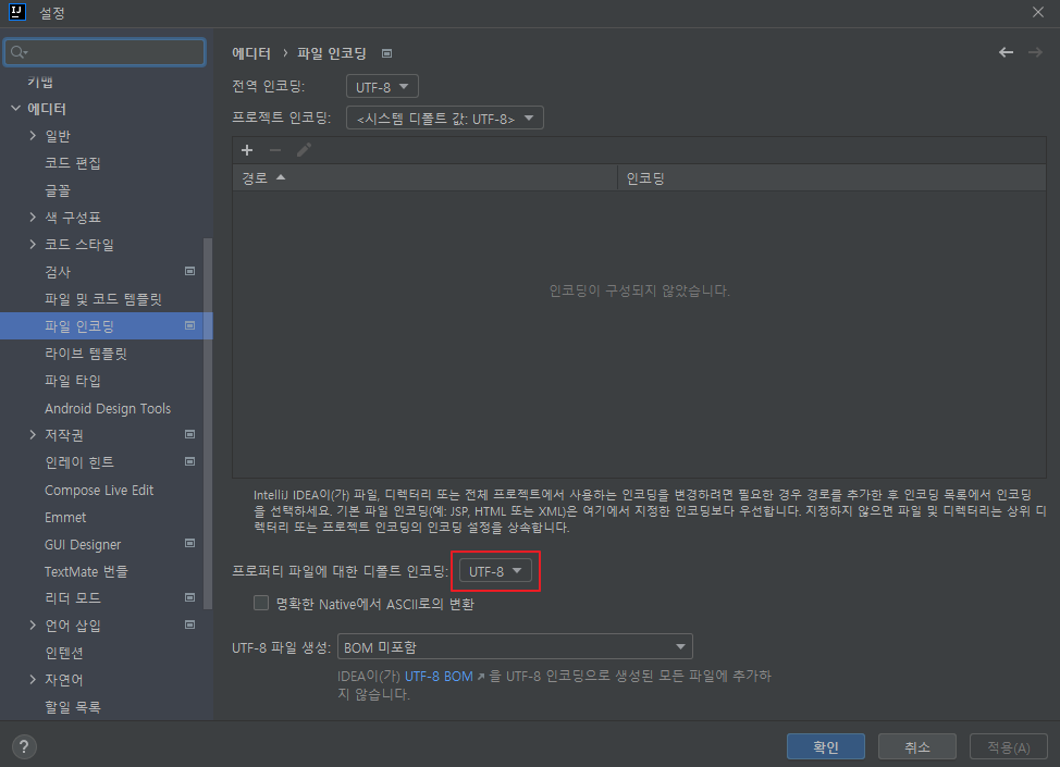 설정 -> 파일 인코딩 -> 프로퍼티 파일에 대한 디폴트 인코딩을 UTF-8로 변경