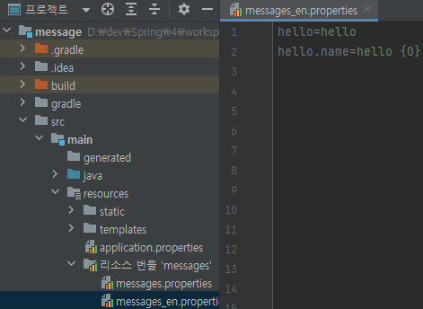 - 추가로 국제화 기능을 적용하려면 messages_en.properties, messages_ko.properties와 같이 파일명 마지막에 언어 정보를 주면 된다. 만약 찾을 수 있는 국제화 파일이 없으면 messages.properties(언어정보가 없는 파일명)를 기본으로 사용한다.