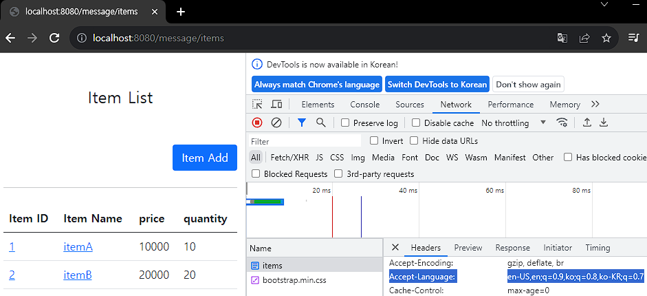 결국 스프링도 Locale 정보를 알아야 언어를 선택할 수 있는데, 스프링은 언어 선택 시 기본으로 AcceptLanguage 헤더의 값을 사용한다.