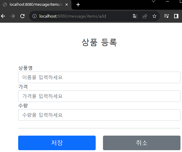 <div class="py-5 text-center"> <h2 th:text="#{page.addItem}">상품 등록 폼</h2> </div> <form action="item.html" th:action th:object="${item}" method="post"> <div> <label for="itemName" th:text="#{label.item.itemName}">상품명</label> <input type="text" id="itemName" th:field="*{itemName}" class="form-control" placeholder="이름을 입력하세요"> </div> <div> <label for="price" th:text="${label.item.price}">가격</label> <input type="text" id="price" th:field="*{price}" class="form-control" placeholder="가격을 입력하세요"> </div> <div> <label for="quantity" th:text="${label.item.quantity}">수량</label> <input type="text" id="quantity" th:field="*{quantity}" class="form-control" placeholder="수량을 입력하세요"> </div> <hr class="my-4"> <div class="row"> <div class="col"> <button class="w-100 btn btn-primary btn-lg" type="submit" th:text="${button.save}">저장</button> </div> <div class="col"> <button class="w-100 btn btn-secondary btn-lg" onclick="location.href='items.html'" th:onclick="|location.href='@{/message/items}'|" type="button" th:text="${button.cancel}">취소</button> </div> </div> </form>