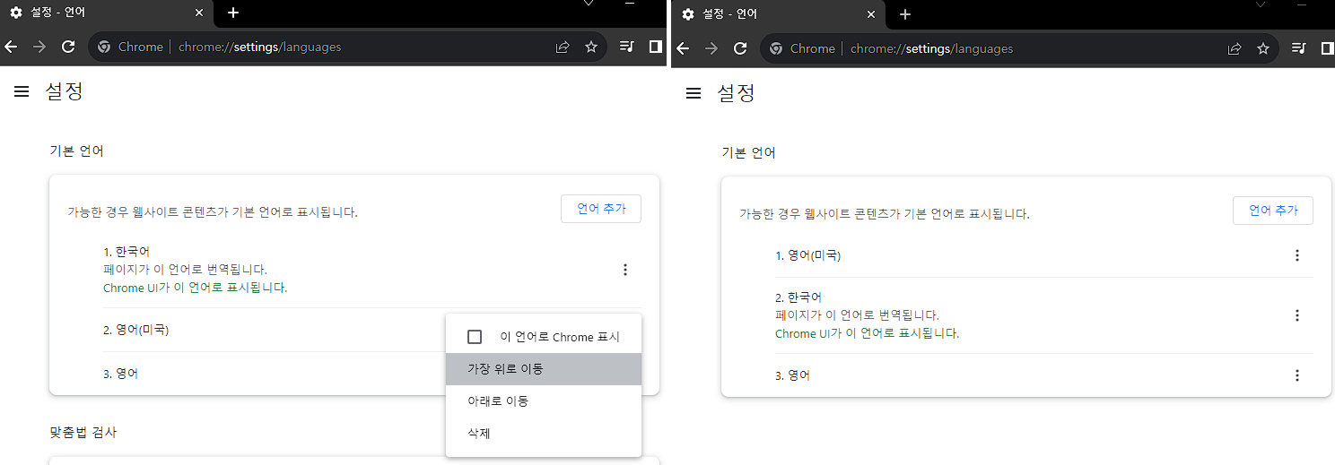크롬 브라우저 -> 설정 -> 언어를 검색하고, 우선순위를 변경하면 된다.
