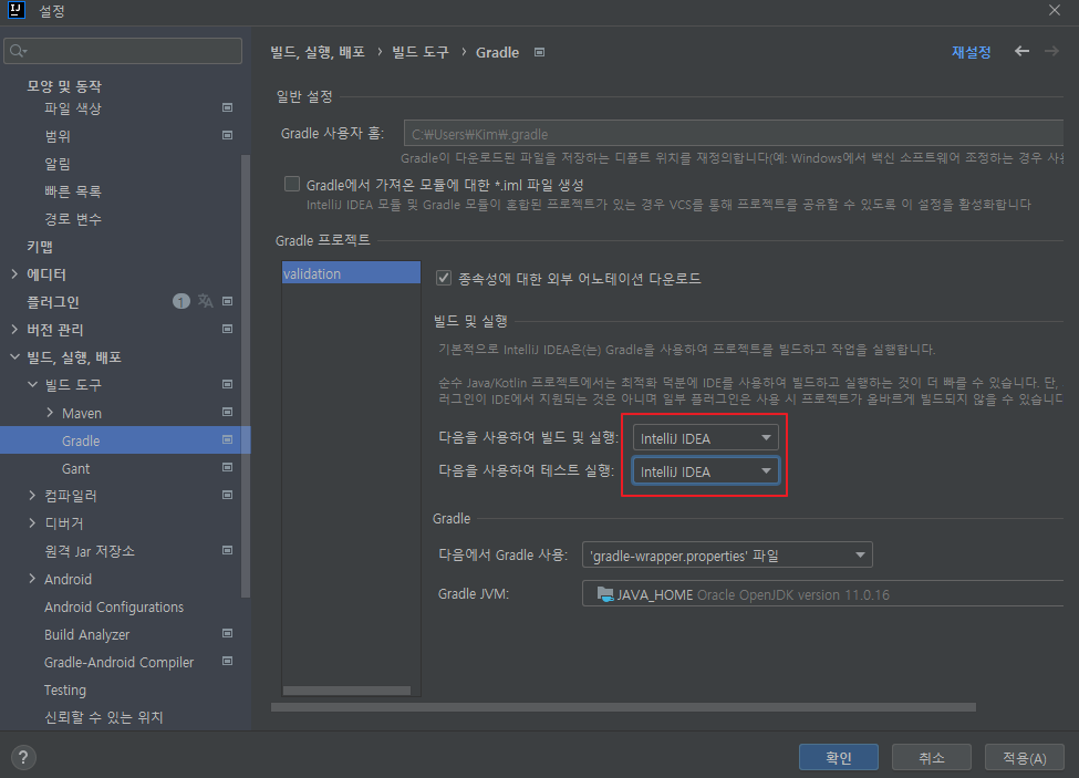 설정 -> Gradle -> Intelij IDEA로 변경