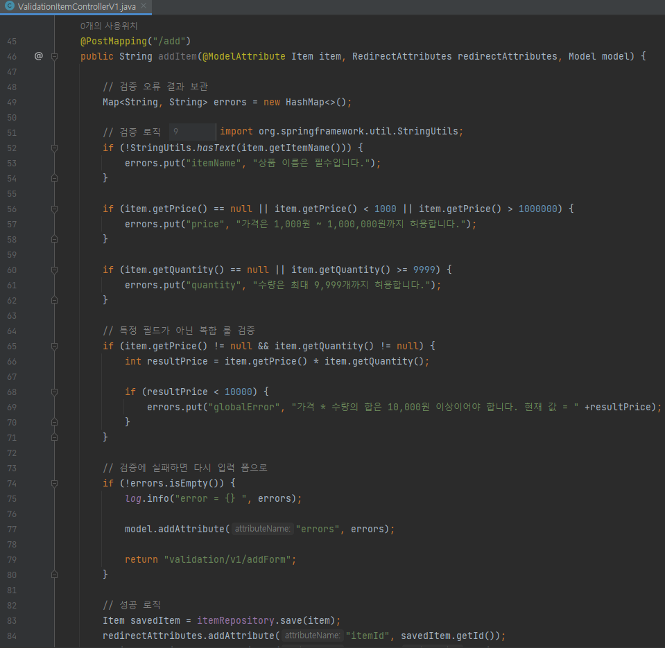 @PostMapping("/add") public String addItem(@ModelAttribute Item item, RedirectAttributes redirectAttributes, Model model) { // 검증 오류 결과 보관 Map<String, String> errors = new HashMap<>(); // 검증 로직 if (!StringUtils.hasText(item.getItemName())) { errors.put("itemName", "상품 이름은 필수입니다."); } if (item.getPrice() == null || item.getPrice() < 1000 || item.getPrice() > 1000000) { errors.put("price", "가격은 1,000원 ~ 1,000,000원까지 허용합니다."); } if (item.getQuantity() == null || item.getQuantity() >= 9999) { errors.put("quantity", "수량은 최대 9,999개까지 허용합니다."); } // 특정 필드가 아닌 복합 룰 검증 if (item.getPrice() != null && item.getQuantity() != null) { int resultPrice = item.getPrice() * item.getQuantity(); if (resultPrice < 10000) { errors.put("globalError", "가격 * 수량의 합은 10,000원 이상이어야 합니다. 현재 값 = " +resultPrice); } } // 검증에 실패하면 다시 입력 폼으로 if (!errors.isEmpty()) { log.info("error = {} ", errors); model.addAttribute("errors", errors); return "validation/v1/addForm"; } // 성공 로직 Item savedItem = itemRepository.save(item); redirectAttributes.addAttribute("itemId", savedItem.getId()); redirectAttributes.addAttribute("status", true); return "redirect:/validation/v1/items/{itemId}"; }