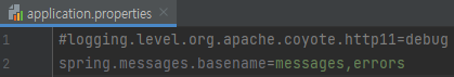 먼저 스프링 부트가 해당 메시지 파일을 인식할 수 있게 다음 설정을 추가한다. 이렇게 하면 messages.properties, errors.properties 두 파일을 모두 인식한다. (생략하면 messages.properties를 기본으로 인식한다.)