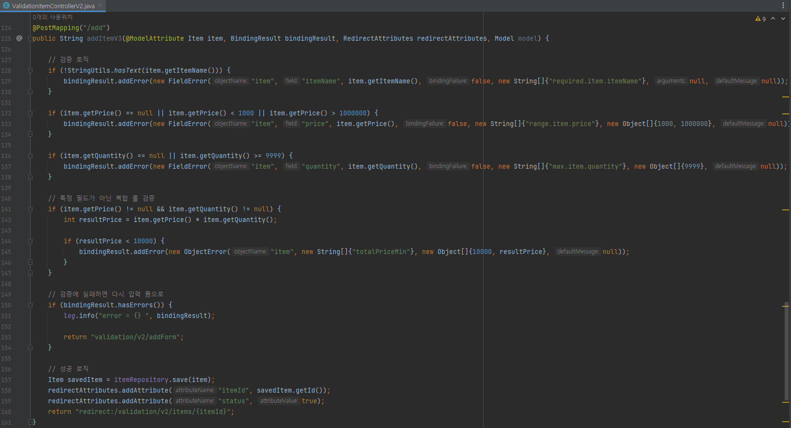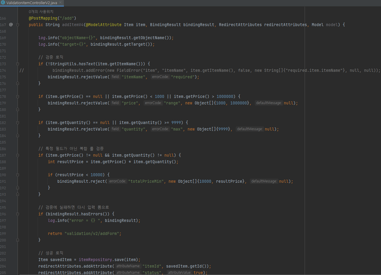 @PostMapping("/add") public String addItemV3(@ModelAttribute Item item, BindingResult bindingResult, RedirectAttributes redirectAttributes, Model model) { // 검증 로직 if (!StringUtils.hasText(item.getItemName())) { bindingResult.addError(new FieldError("item", "itemName", item.getItemName(), false, new String[]{"required.item.itemName"}, null, null)); } if (item.getPrice() == null || item.getPrice() < 1000 || item.getPrice() > 1000000) { bindingResult.addError(new FieldError("item", "price", item.getPrice(), false, new String[]{"range.item.price"}, new Object[]{1000, 1000000}, null)); } if (item.getQuantity() == null || item.getQuantity() >= 9999) { bindingResult.addError(new FieldError("item", "quantity", item.getQuantity(), false, new String[]{"max.item.quantity"}, new Object[]{9999}, null)); } // 특정 필드가 아닌 복합 룰 검증 if (item.getPrice() != null && item.getQuantity() != null) { int resultPrice = item.getPrice() * item.getQuantity(); if (resultPrice < 10000) { bindingResult.addError(new ObjectError("item", new String[]{"totalPriceMin"}, new Object[]{10000, resultPrice}, null)); } } // 검증에 실패하면 다시 입력 폼으로 if (bindingResult.hasErrors()) { log.info("error = {} ", bindingResult); return "validation/v2/addForm"; } // 성공 로직 Item savedItem = itemRepository.save(item); redirectAttributes.addAttribute("itemId", savedItem.getId()); redirectAttributes.addAttribute("status", true); return "redirect:/validation/v2/items/{itemId}"; }