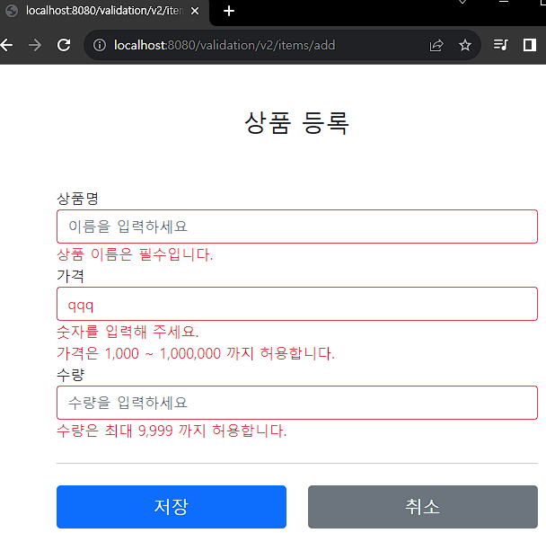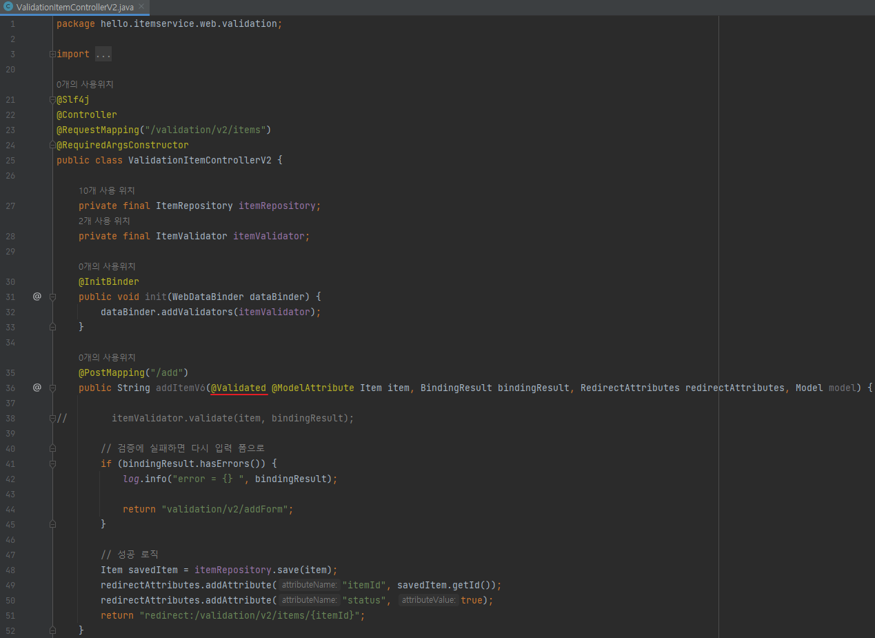 @InitBinder public void init(WebDataBinder dataBinder) { dataBinder.addValidators(itemValidator); } @PostMapping("/add") public String addItemV6(@Validated @ModelAttribute Item item, BindingResult bindingResult, RedirectAttributes redirectAttributes, Model model) { // itemValidator.validate(item, bindingResult); // 검증에 실패하면 다시 입력 폼으로 if (bindingResult.hasErrors()) { log.info("error = {} ", bindingResult); return "validation/v2/addForm"; } // 성공 로직 Item savedItem = itemRepository.save(item); redirectAttributes.addAttribute("itemId", savedItem.getId()); redirectAttributes.addAttribute("status", true); return "redirect:/validation/v2/items/{itemId}"; }