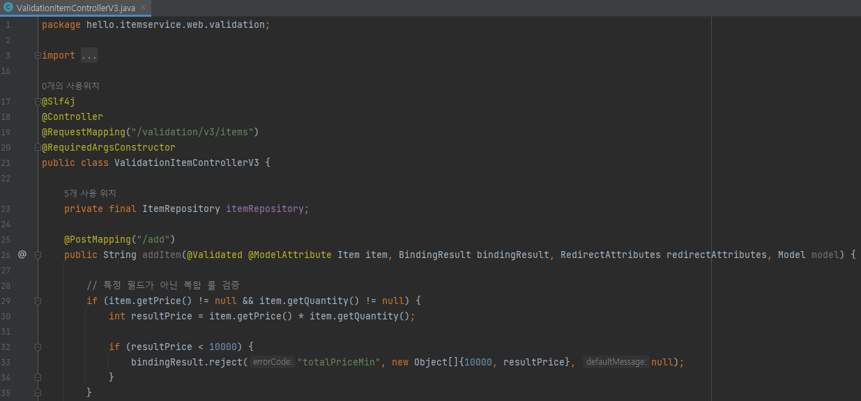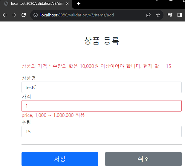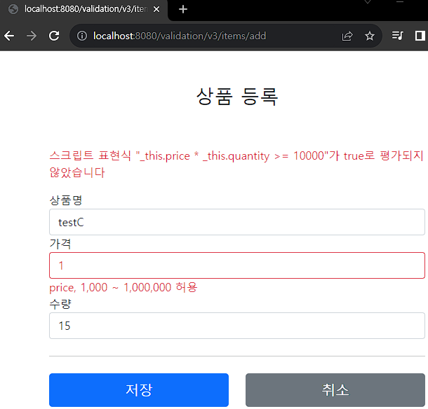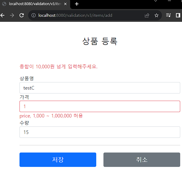 // 특정 필드가 아닌 복합 룰 검증 if (item.getPrice() != null && item.getQuantity() != null) { int resultPrice = item.getPrice() * item.getQuantity(); if (resultPrice < 10000) { bindingResult.reject("totalPriceMin", new Object[]{10000, resultPrice}, null); } }