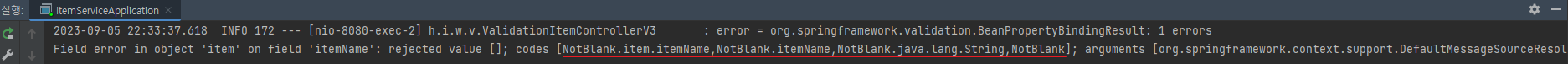 Bean Validation을 적용하고 bindingResult에 등록된 검증 오류 코드를 보자. 오류 코드가 애노테이션 이름으로 등록된다. 마치 typeMismatch와 유사하다