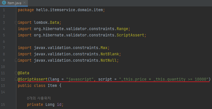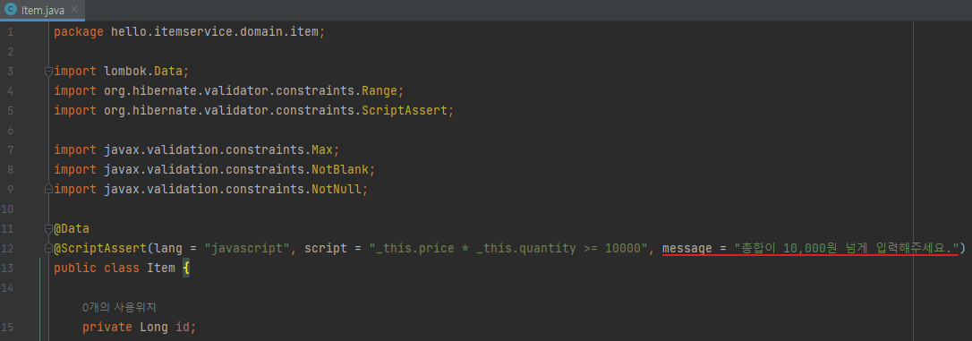 @ScriptAssert(lang = "javascript", script = "_this.price * _this.quantity >= 10000", message = "총합이 10,000원 넘게 입력해주세요.")