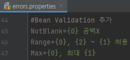 #Bean Validation 추가 NotBlank={0} 공백X Range={0}, {2} ~ {1} 허용 Max={0}, 최대 {1}